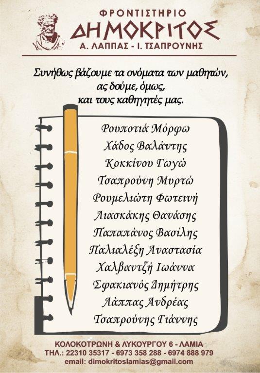 ΓΙΑ ΜΙΑ ΑΚΟΜΗ ΧΡΟΝΙΑ, ΕΙΜΑΣΤΕ ΕΔΩ ΚΑΙ ΣΑΣ ΠΕΡΙΜΕΝΟΥΜΕ !!! ΤΑ ΚΑΛΟΚΑΙΡΙΝΑ ΜΑΣ ΤΜΗΜΑΤΑ ΑΝΟΙΓΟΥΝ ΚΑΙ ΠΕΡΙΜΕΝΟΥΜΕ ΤΟΝ ΚΑΘΕ ΜΑΘΗΤΗ ΠΟΥ ΘΕΛΕΙ ΝΑ ΦΡΕΣΚΑΡΕΙ ΤΙΣ ΓΝΩΣΕΙΣ ΤΟΥ ΚΑΙ ΝΑ ΠΡΟΕΤΟΙΜΑΣΤΕΙ ΓΙΑ ΤΗΝ ΝΕΑ ΧΡΟΝΙΑ . ΤΜΗΜΑΤΑ -ΓΥΜΝΑΣΙΟΥ -ΛΥΚΕΙΟΥ ΔΟΥΛΕΙΑ ΜΑΣ ΕΙΝΑΙ ΝΑ ΣΑΣ ΠΡΟΕΤΟΙΜΑΣΟΥΜΕ ΓΙΑ ΤΗΝ ΝΕΑ ΧΡΟΝΙΑ ΚΑΙ ΕΣΕΙΣ ΑΡΚΕΙ ΝΑ ΜΑΣ ΕΜΠΙΣΤΕΥΤΕΙΤΕ .…